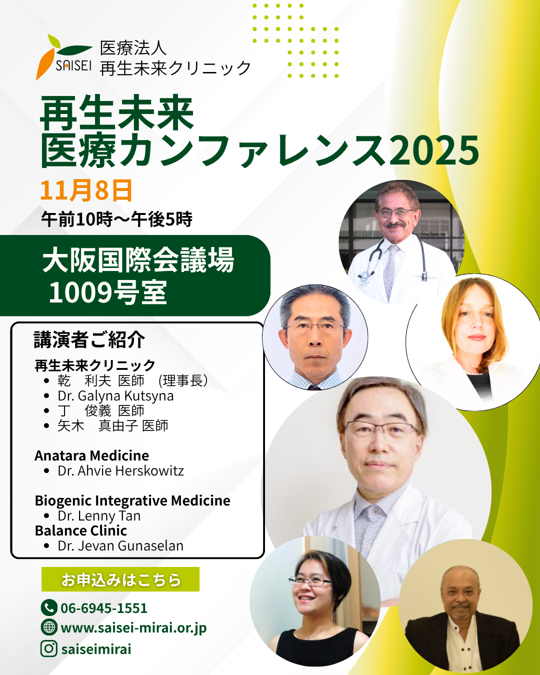再生未来クリニック神戸 0120-462-100HIFUのみ 京阪クリニック 0120-462-130がん免疫治療免疫治療肌細胞・美容治療若返り免疫治療 サイエンスクリニック 0120-462-105若返り免疫治療 再生未来 抗老化カンファレンス2025 登録ボタン 【若返り外来診療開始のお知らせ】 この度若返り外来を開始させていただきます。 若返り治療とは、見た目を若返らせるだけでなく、体の内側から改善することを意味します。免疫システムを正常化そして若返りさせることで、生物学的年齢を減らして、健康な寿命を延ばすことを目標としています。 当院の主な若返り療法には以下のものがございます: 食品MAFとGcMAF注射 皮膚線維芽細胞療法 ナイーブ T / NK 細胞 多血小板血漿(PRP) 高濃度ビタミンC 人由来プラセンタ(胎盤)製品 アルファリポ酸 来院ご希望の方はお気軽にお問い合わせください。 大切なお知らせ 平素より格別のご理解とご協力を賜り、厚く御礼申し上げます。2025年8月29日、厚生労働省は、東京都中央区の「現称:東京サイエンスクリニック(一般社団法人日本医療会)/ 旧称:ティーエスクリニック(一般社団法人TH)」 において、8月20日に再生医療を受けた50歳代外国人女性がアナフィラキシーショックにより死亡した事例を公表しました。本件は、「医療法人再生未来 サイエンスクリニック」とは一切関係ございません。名称が類似しておりますが、当法人とは全く異なる医療機関です。皆様には名称が似ていることで、誤解やご心配・ご迷惑をおかけしておりますことを心よりお詫び申し上げます。当院では引き続き、患者様に安心して診療を受けていただけるよう、医療安全に最大限配慮し、誠実に取り組んでまいります。 今後ともどうぞよろしくお願い申し上げます。医療法人再生未来サイエンスクリニック 【移転と合併のお知らせ】 平素より京阪クリニックと再生未来クリニック神戸をご利用いただき、誠にありがとうございます。 このたび京阪クリニックと再生未来クリニック神戸は、より良い医療サービスをご提供するため合併いたしました。守口市、神戸市から大阪市中央区のOMMビルへ移転いたしました。 新住所:〒540-0008大阪府大阪市中央区大手前1-7-31 OMMビル 9F 今後とも変わらぬご愛顧のほど、よろしくお願い申し上げます。 お知らせ Science Featured に研究記事が掲載されました (2025年7月) 「細胞の老化からどのように守れるか?」🔗 記事はこちらからご覧いただけます特別に改良されたホエイプロテイン(Dietary MAF)が染色体のテロメアを保護・延長し、細胞の老化を遅らせる可能性があることを発見した研究成果をご紹介しています。若齢マウスと高齢マウスの両方で顕著な効果が見られ、細胞の健康維持、加齢に伴う機能低下の予防、さらにはメンタルヘルスへの効果にも期待が寄せられています。 2025年大阪・関西万博 セルビア館にてプレゼンテーションを行いました 再生未来グループCEOの乾院長、セルビア支部の藤田医師とともに、2025年大阪・関西万博のセルビア館にてプレゼンテーションを行いました。再生医療や長寿科学の未来に向けた私たちのビジョンを、世界に向けて発信する貴重な機会となりました。今後も、再生未来は先端医療を通じて世界に貢献し続けてまいります。👉 当日の様子はこちら 抗老化カンファレンス開催のご報告 2025年6月14日(土)、大阪OMMビルディングにて再生未来主催「抗老化カンファレンス2025」を開催いたしました。世界各国から第一線で活躍されている専門家の皆様にご登壇いただき、長寿医療の最前線について活発な議論が交わされました。このような有意義な機会を通じて、多くの方々と知見を共有できたことを大変嬉しく思っております。今後も再生未来は、長寿科学と再生医療の発展に貢献してまいります。📺 当日の録画視聴をご希望の方は、以下よりお申込みいただけます。👉 録画視聴のお申込みはこちら プレスリリースのお知らせ (2025年3月27日) このたび、弊社は新しい研究成果に関するプレスリリースを発表いたしました。この研究では、特殊な脱ガラクトース化ホエイプロテイン(D-WP)の摂取が、若年および高齢マウスの末梢血テロメア長を有意に増加させることが示され、細胞の寿命延長や健康寿命の促進に寄与する可能性が示唆されています。詳細は以下のリンクよりご覧いただけます。脱ガラクトース化ホエイプロテインがテロメア長を伸長し、抗老化効果を示唆する新研究今後ともどうぞよろしくお願いいたします。 natureに掲載されました!(2025年3月13日) 2025年3月13日付で、特集企画Focal Point on Ageing in Japanの一部として、Nature.com(※)に記事広告「Could immune proteins have anti-ageing benefits?」が掲載されました。※Nature.comは最先端の科学を伝える国際的な総合科学誌Natureのオンライン版です。記事広告URL:https://www.nature.com/articles/d42473-024-00361-3 長寿に関わる遺伝子、テロメアの伸長を確認しました 若返りへの挑戦ーテロメア伸長臨床試験(MAF) 脱ガラクトース化ホエイタンパク質の