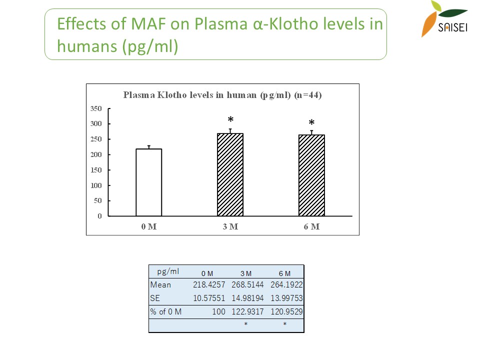 ~20% increase in plasma α-Klotho levels at 3 and 6 months