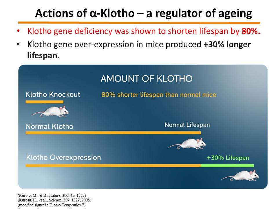 Reduced α-Klotho expression has been linked to accelerated biological aging, neurodegeneration, renal dysfunction, and increased susceptibility to age-related diseases. Conversely, preservation or enhancement of α-Klotho levels has been shown to support neuroprotection, renal health, and overall lifespan extension.